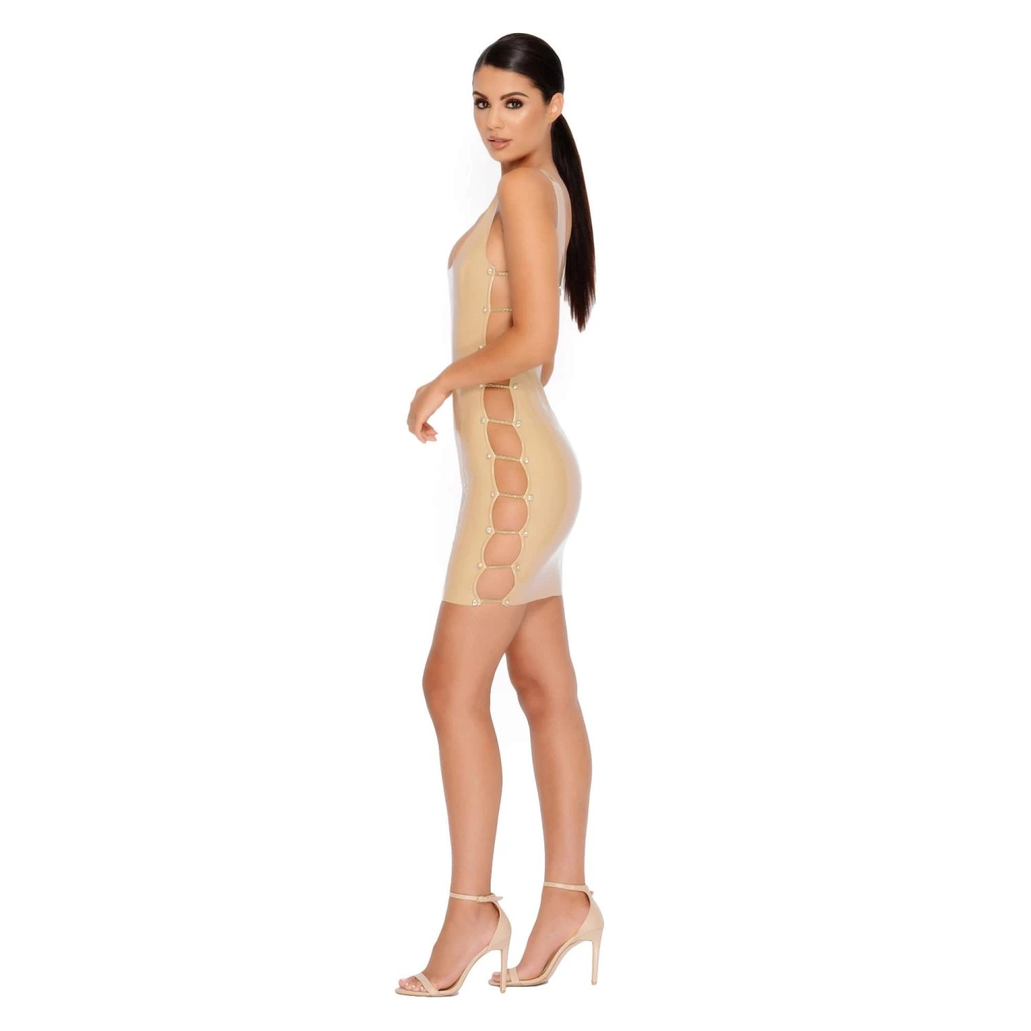 Chain Me Down vinyl mini dress features cut-out sides with chain and buckle detailing. Designed in our premium vinyl fabric, the dress has a soft interior lining and a taught fit made to shape and lift the body.