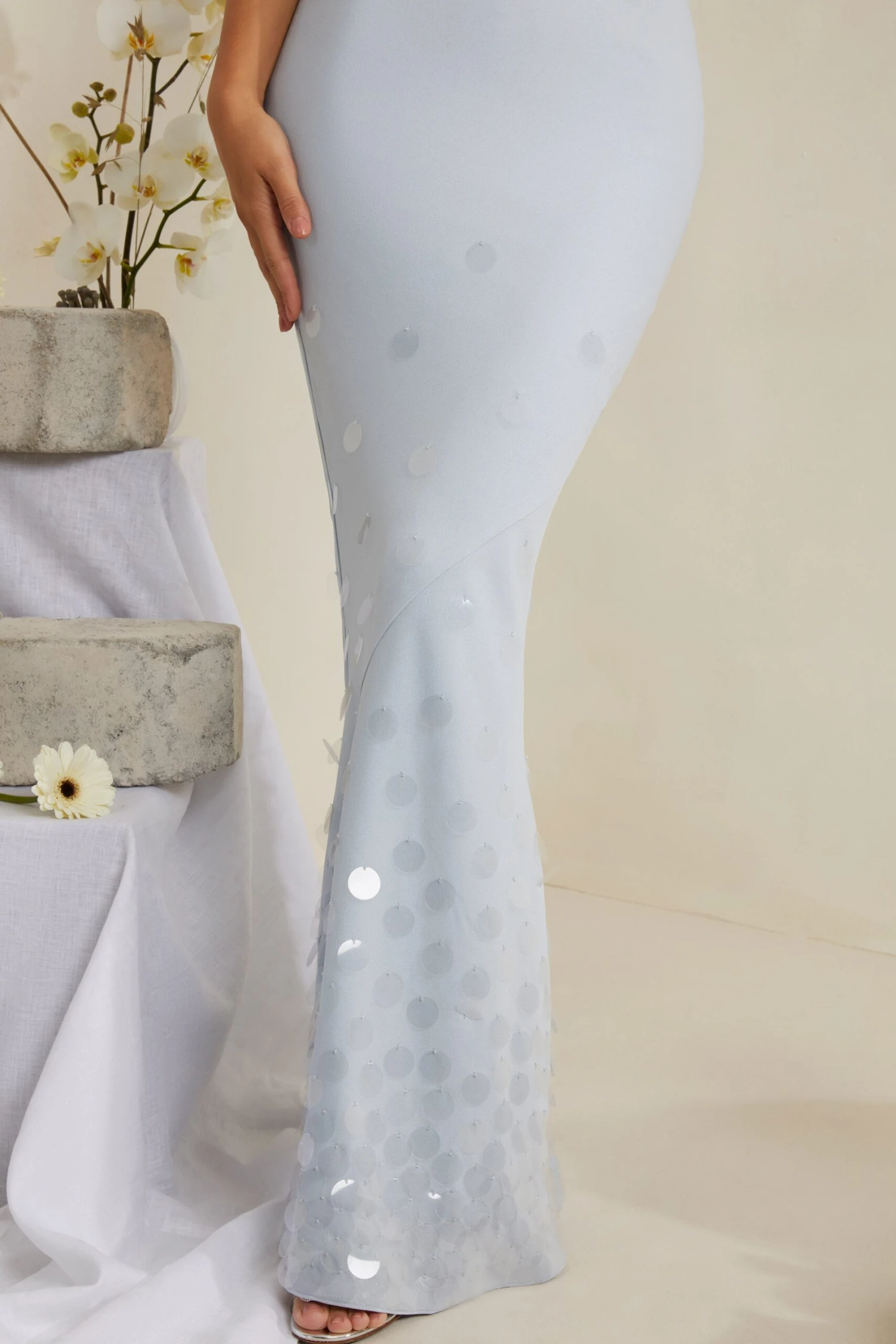 - Large sequin scattered embellishment at the hem