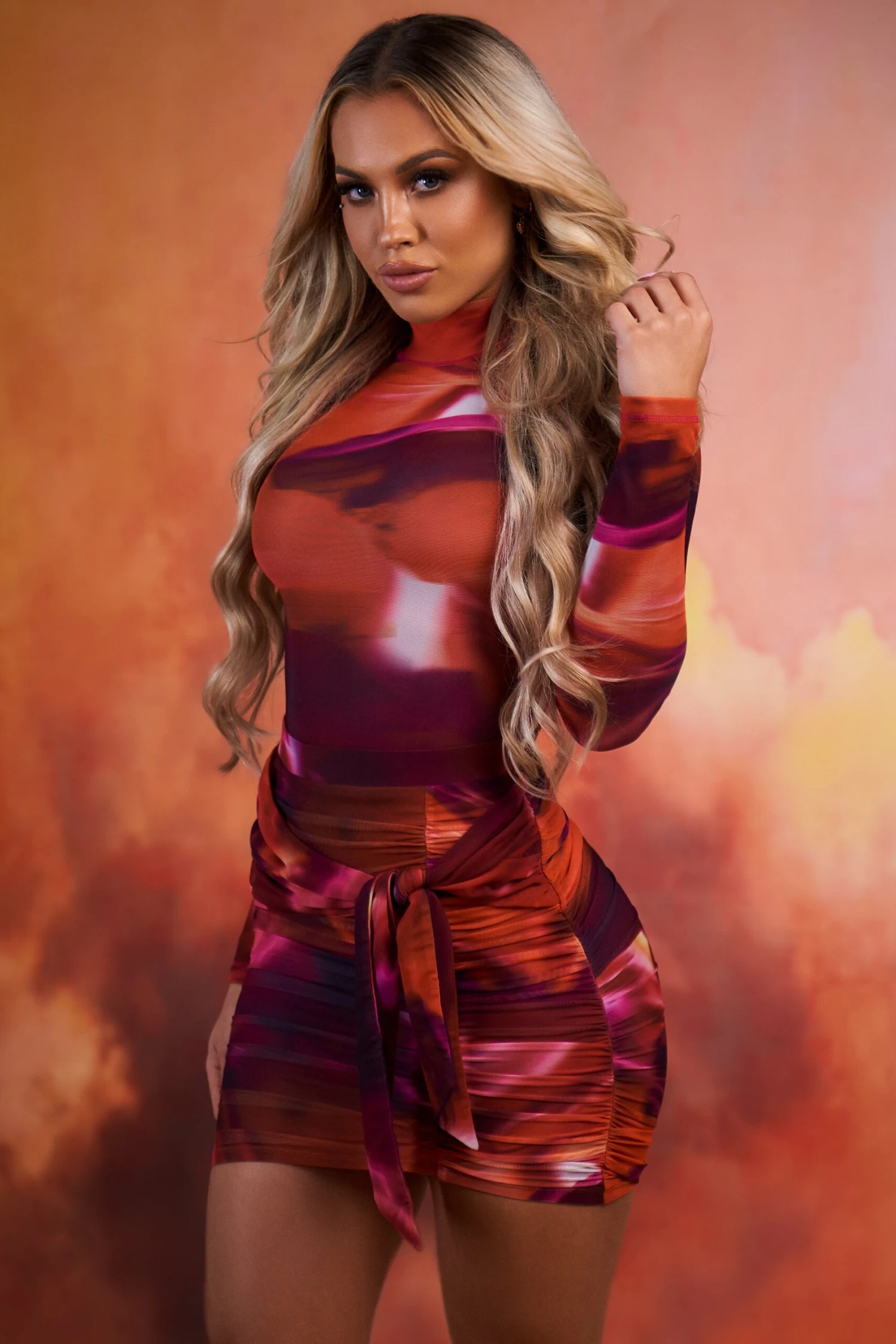 Prepare to burn bright in this one, honey. In a galactic inspired print, Supernova mesh bodysuit features a chic high neck design and tight-fitting long sleeves. We love styling this high leg bodysuit with our mesh mini skirt or flared trousers, for a sleek ‘fit that makes a serious statement, babe.