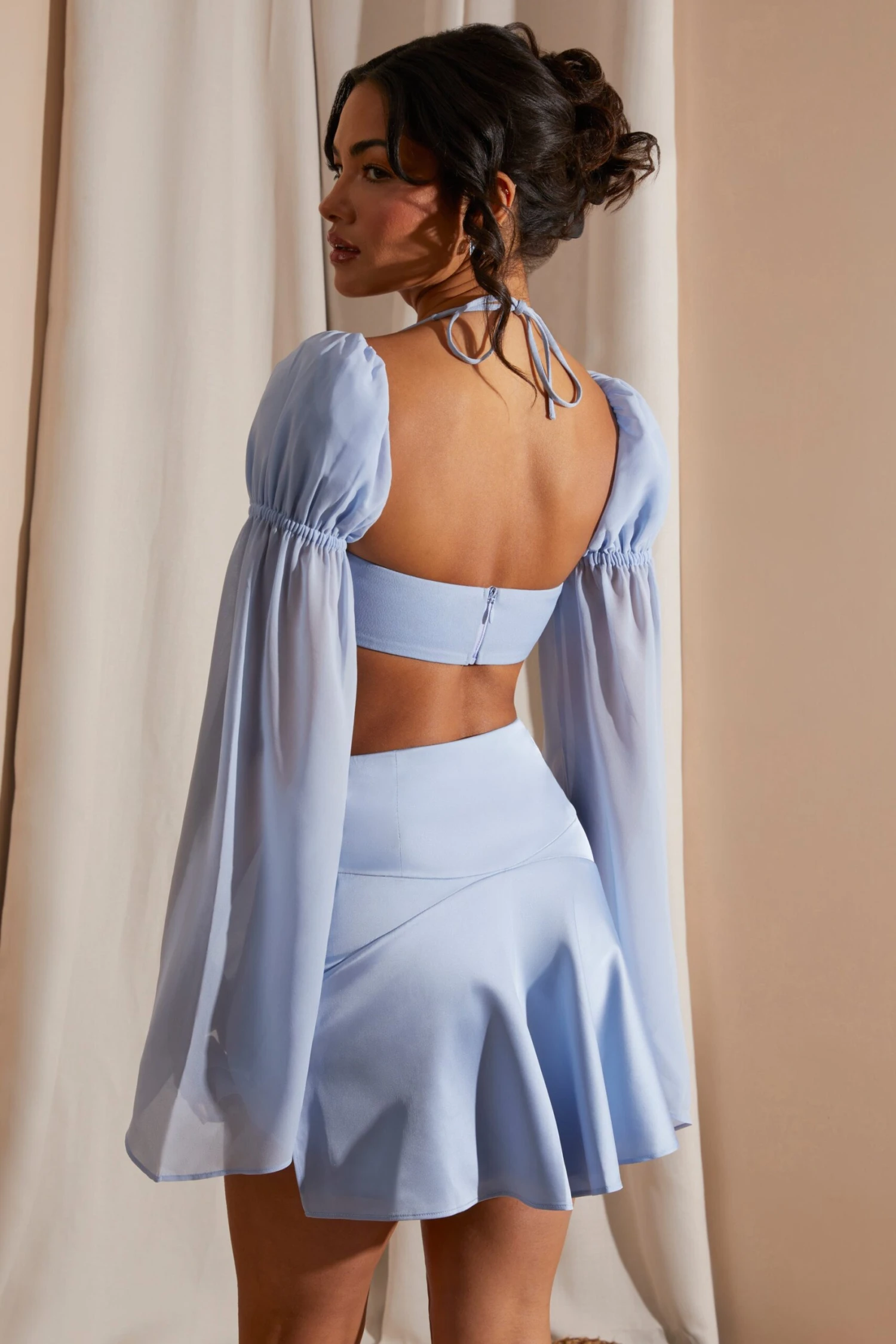 Chic and bohemian, the Kateri long sleeve bralette is a fun and floaty separate piece with romantic detailing. Made from our premium georgette fabric, the Kateri bralette has a curved neckline with halter neck shoulder straps that accentuates the bust. Super cropped with delicate puff sleeves that gather before falling into wide, flare sleeves, the Kateri bralette is a romantic and floaty design perfect for the new season.