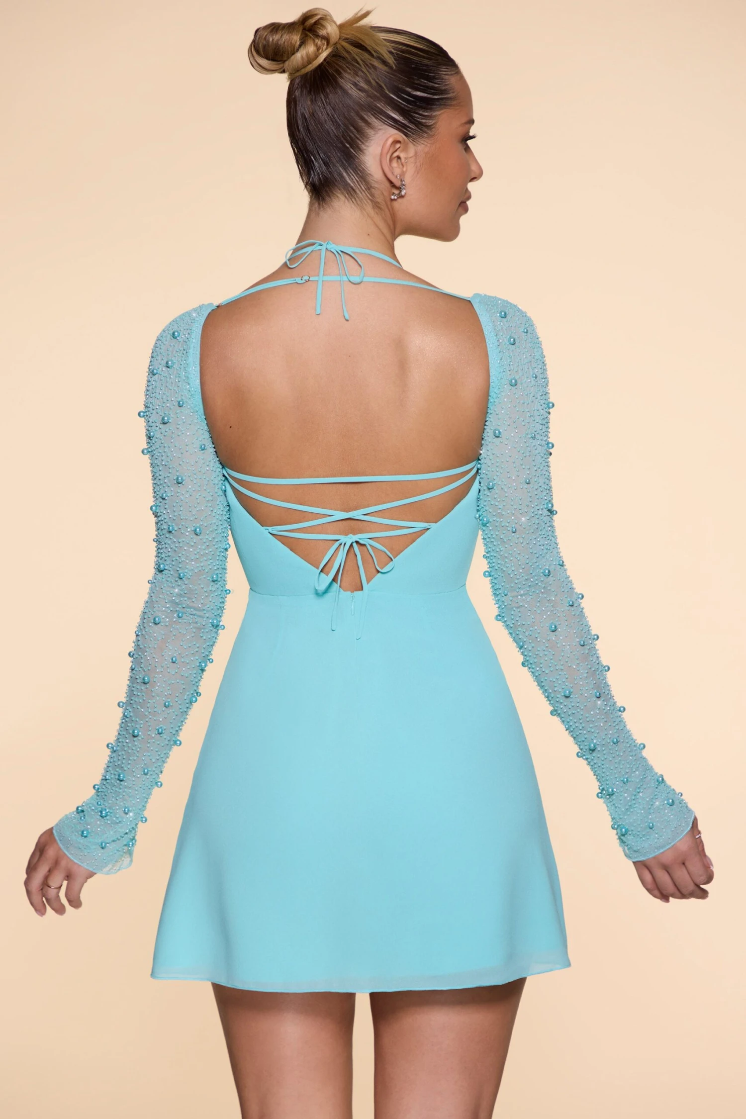 Delicate and feminine, the Florence mini dress was designed to captivate attention. Designed in our whimsical georgette fabric with full length mesh sleeves hand embellished with pearl and bead adornment, Florence is a romantic style perfect for elegant date nights. The bust flattering, pleated cowl neckline is accentuated with dainty self tie halter neck straps whilst the curve skimming, a-line mini skirt features romantic ruffle detailing at the thigh. All about the finer details, the Florence mini dress is compete with a seductive open back with criss-cross straps creating a caged effect.Â