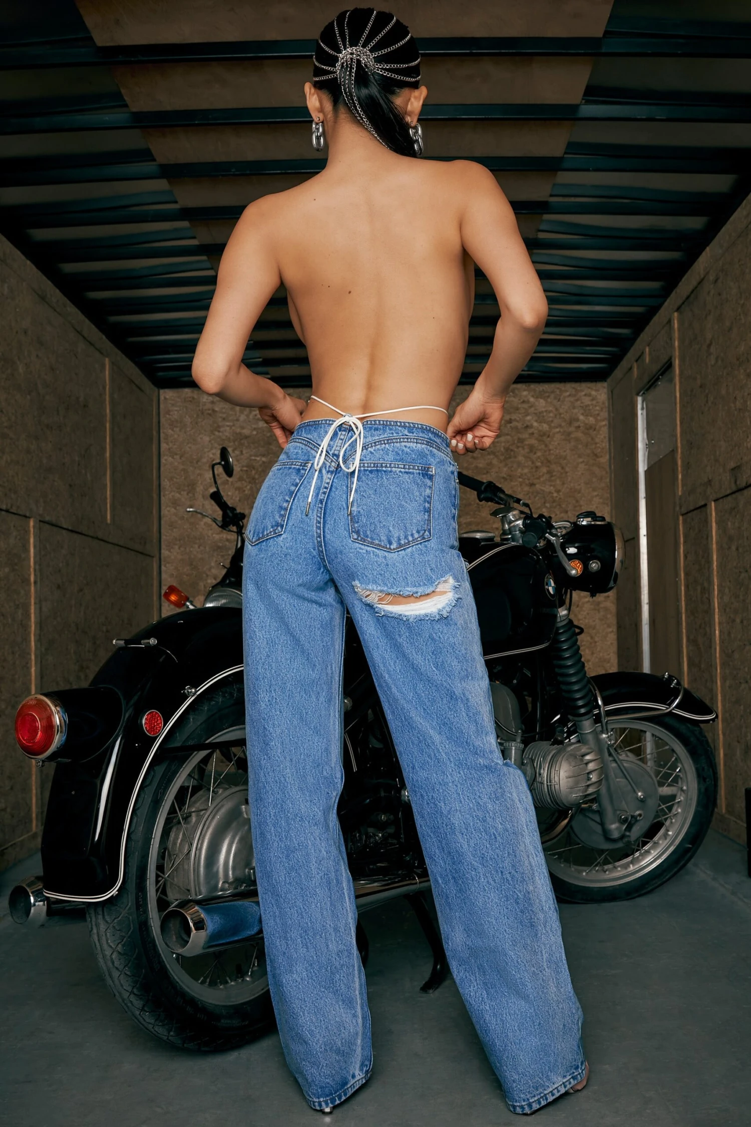 Cut from our rigid denim that hugs the hips and then falls to a flattering boyfriend fit, our low rise jeans also feature distressed detailing throughout the design and a statement tear at the top of the left thigh on the reverse. Complete with delicate high waist straps that ensure the illusion of a cinched waist, these straps can be adjusted at the back to allow for your most comfortable fit.