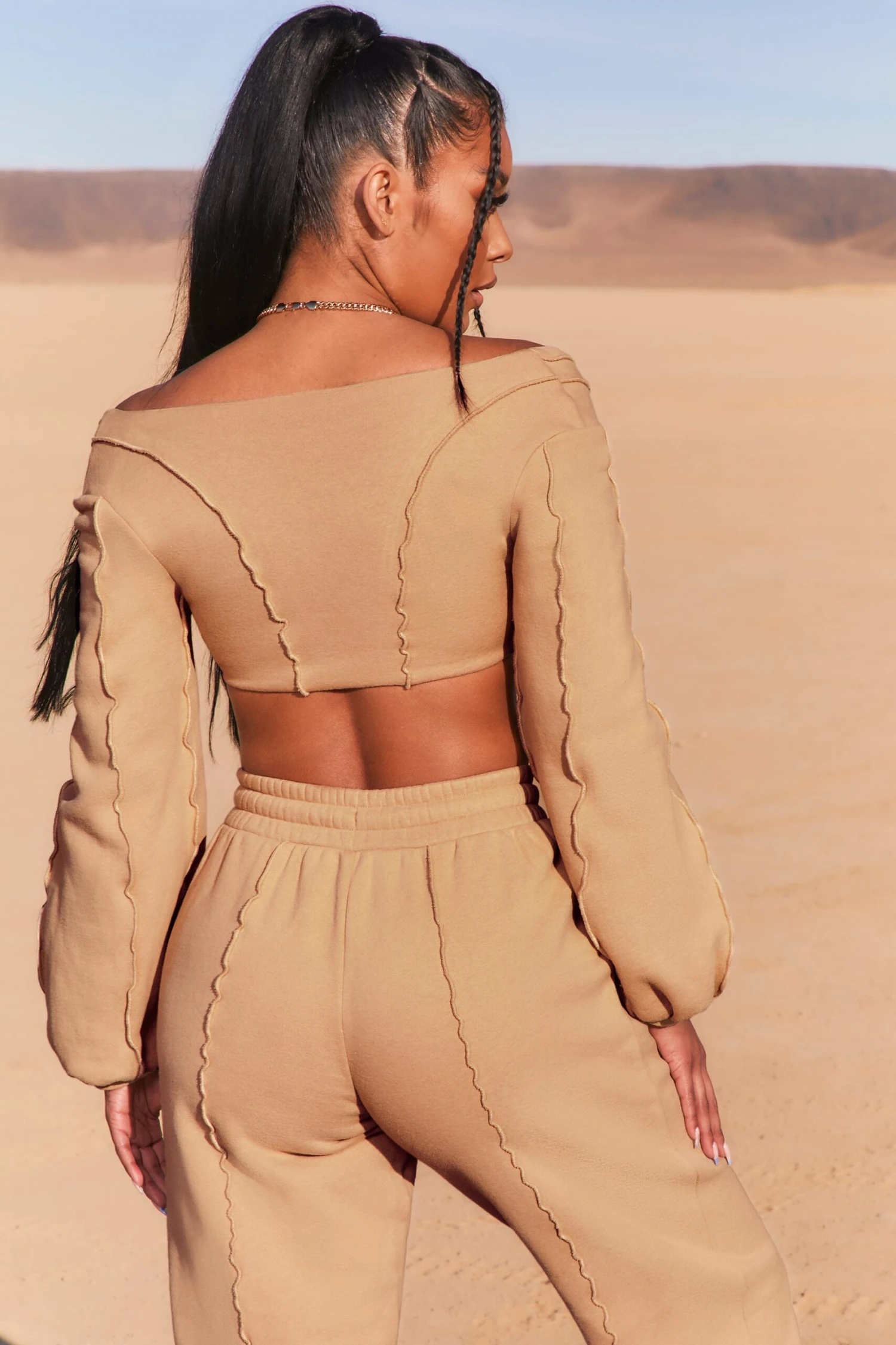 Uncover a new you, babe, in our bardot crop top. Styled in an off the shoulder cut with long, voluminous balloon sleeves and stretch cuffs for added drama, our cropped top in smooth, premium cotton is complete with exposed seam detailing for extra edge. Paired with the coordinating joggers and subtle gold jewellery, this look was made to be unveiled asap, honey.